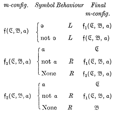 “从 m-构型 $f(\mathfrak{C}, \mathfrak{B}, a)$ 开始,机器查找最左边的 $a$... 然后 m-构型变为 $\mathfrak{C}$。如果没有 $a$,则... 变为 $\mathfrak{B}$。”