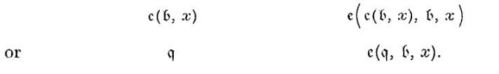The only expressions which are admissible for substitution in an m-function are the m-configurations and symbols of the machine. These have to be enumerated more or less explicitly: they may include expressions such as $p(e, x)$; indeed they must if there are any m-functions used at all. If we did not insist on this explicit enumeration, but simply stated that the machine had certain m-configurations (enumerated) and all m-configurations obtainable by substitution of m-configurations in certain m-functions, we should usually get an infinity of m-configurations; e.g., we might say that the machine was to have the m-configuration $q$ and all m-configurations obtainable by substituting an m-configuration for $\mathfrak{C}$ in $p(\mathfrak{C})$. Then it would have $q, p(q), p(p(q)), p(p(p(q))), \ldots$ as m-configurations.