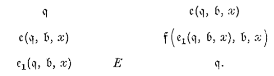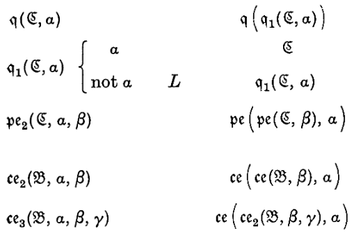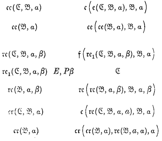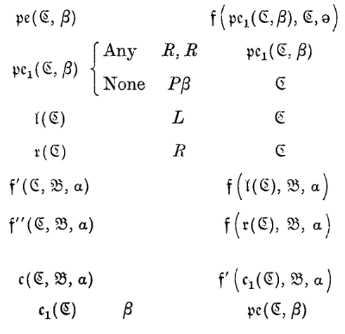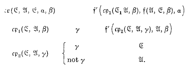 $cpe(\mathfrak{C}, \mathfrak{B}, \mathfrak{E}, \alpha, \beta)$。比较标记为 $\alpha$ 的符号序列与标记为 $\beta$ 的序列。如果它们相似,$\to \mathfrak{C}$。否则 $\to \mathfrak{E}$。一些符号 $\alpha$ 和 $\beta$ 会被擦除。