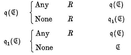 $r(\mathfrak{C})$. From $r(\mathfrak{C})$ the machine shifts to the right one square and $\to \mathfrak{C}$.